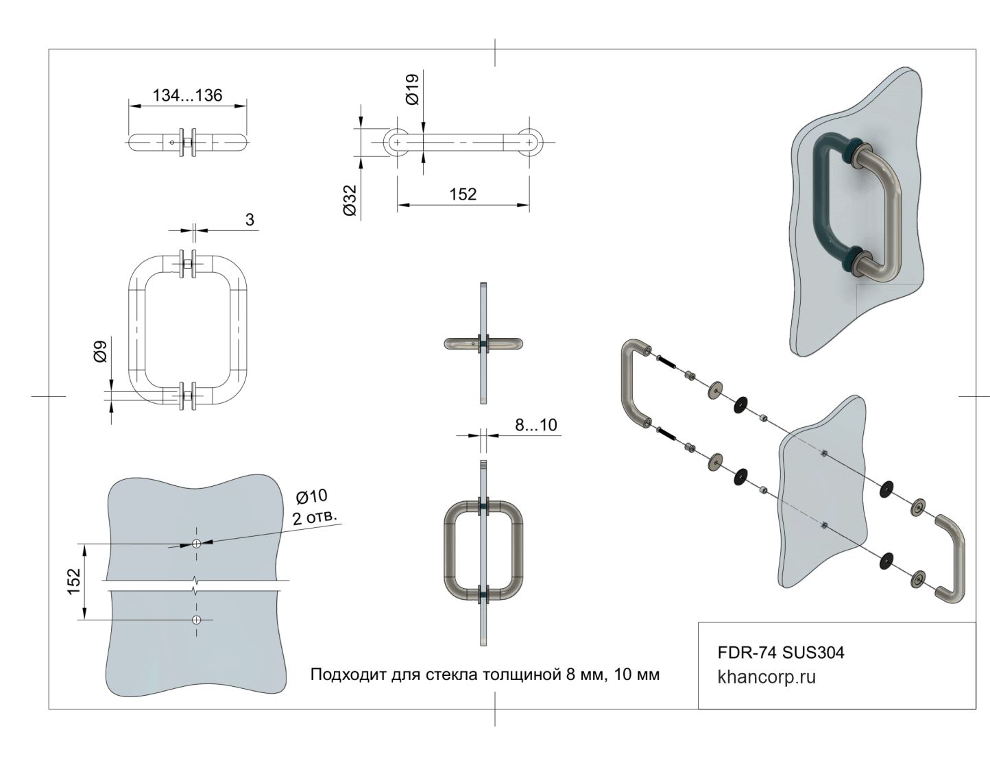 Ручка FDR-74, совмещённая с функцией полотенцесушителя, выполнена из нержавеющей стали толщиной 1 мм, обеспечивающей надёжность и устойчивость к коррозии. Межцентровое расстояние между крепежными отверстиями составляет 152 мм, общая длина изделия равна 187 мм. Универсальность установки проявляется возможностью размещать её как горизонтально, так и вертикально, при этом оба варианта обеспечивают удобство и комфорт при эксплуатации.