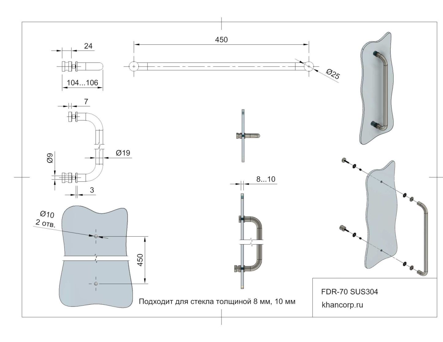 Ручка типа скоба для душевых кабин модели FDR-70 изготавливается из высококачественного материала — нержавеющей стали толщиной всего 1 мм, что гарантирует прочность и надежность конструкции даже при интенсивной эксплуатации. Ее профиль обладает гладкой поверхностью, позволяющей удобно удерживать дверь при открытии и закрытии, исключая возможность скольжения руки. Общая длина ручек определяется межосевым расстоянием между центрами креплений, которое составляет 450 мм, обеспечивая комфортное пространство для захвата. Внешний диаметр профиля самой ручки равен 19 мм, что придает изделию эстетичный и пропорциональный внешний вид.