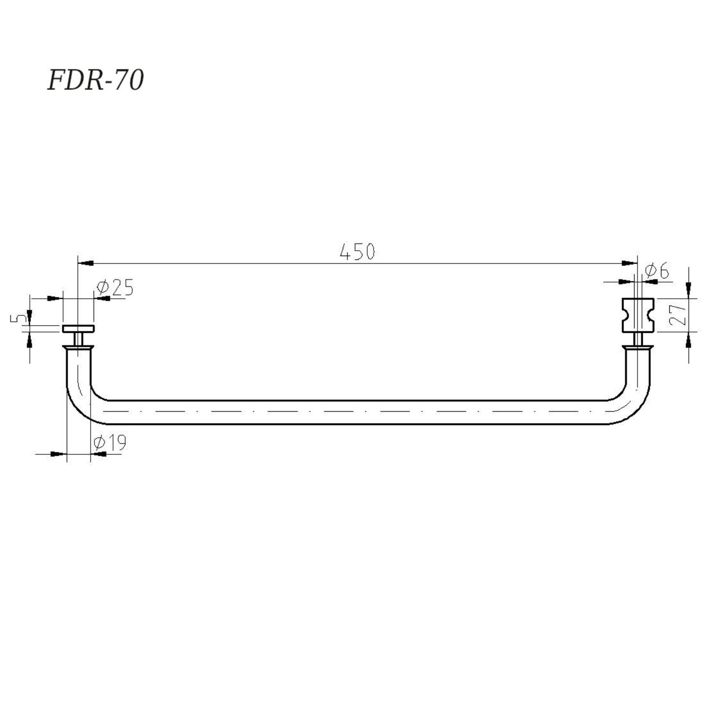 Ручка-скоба для душевых кабин модели FDR-70.1 произведена из высококачественной нержавеющей стали толщиной 1 мм, что обеспечивает надежную защиту от коррозии и долгий срок службы. Профиль изделия характеризуется межосевым расстоянием 450 мм, создающим оптимальное расстояние между крепежными элементами, и диаметром стержня 19 мм, гарантирующим удобство хвата и прочности конструкции.
