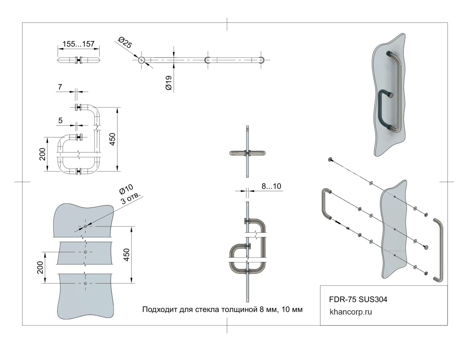 Ручка типа скоба модели FDR-75 изготовлена из нержавеющей стали толщиной 1 мм, что обеспечивает устойчивость к неблагоприятным условиям эксплуатации в среде повышенной влажности. Профиль ручки имеет диаметр 19 мм, придавая изделию аккуратный и привлекательный внешний вид. Укомплектованная двумя межосевыми расстояниями — основным (200 мм) и вторым (450 мм), она предлагает широкие возможности для индивидуальной настройки конфигурации установки.