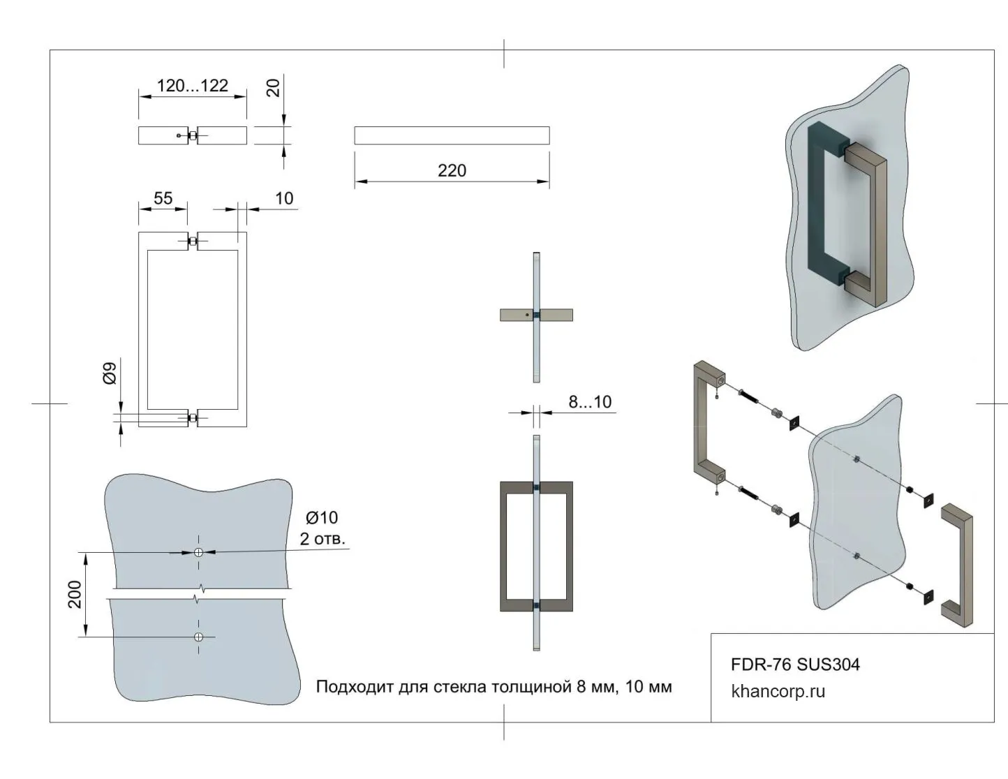 Ручка FDR-76, выполненная в форме скобы, изготовлена из высококачественной нержавеющей стали толщиной 1 мм, что обеспечивает высокий уровень устойчивости к коррозии и долговременную сохранность привлекательного внешнего вида. Основные технические характеристики включают межцентровое расстояние в 200 мм, определяющее область размещения крепежных элементов и делающую ее подходящей для различных моделей душевых кабин.