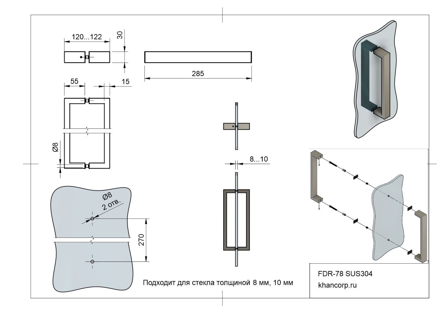 Ручка модели FDR-78 выполнена в форме скобы из нержавеющей стали толщиной 1 мм, что обеспечивает превосходную сопротивляемость коррозии и долгое сохранение эстетичного внешнего вида. Межцентровое расстояние изделия составляет 270 мм, что делает его подходящим для установки на многие современные душевые кабины, где используются стеклянные панели толщиной от 8 до 10 мм.