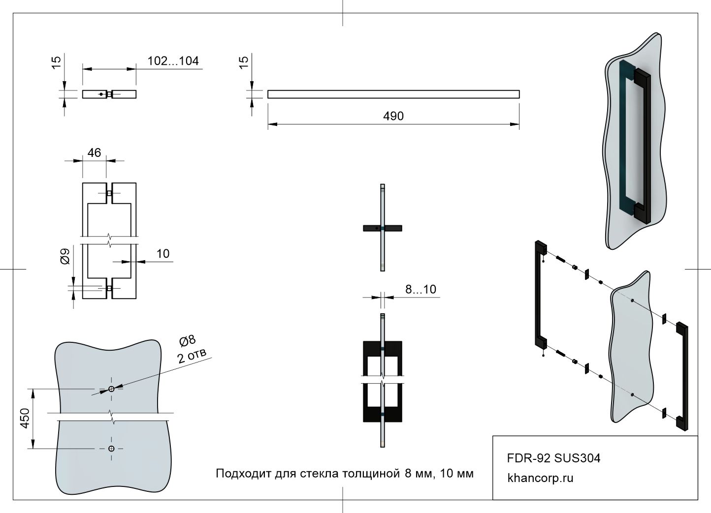 Ручка модели FDR-92 выполнена в форме скобы из прочной нержавеющей стали толщиной 1 мм, что обеспечивает высокую устойчивость к появлению коррозии и долгий срок службы. Важной характеристикой изделия является межцентровое расстояние, равное 450 мм, позволяющее удобно располагать ручку на стеклянных дверях душевых кабин с различной геометрией.