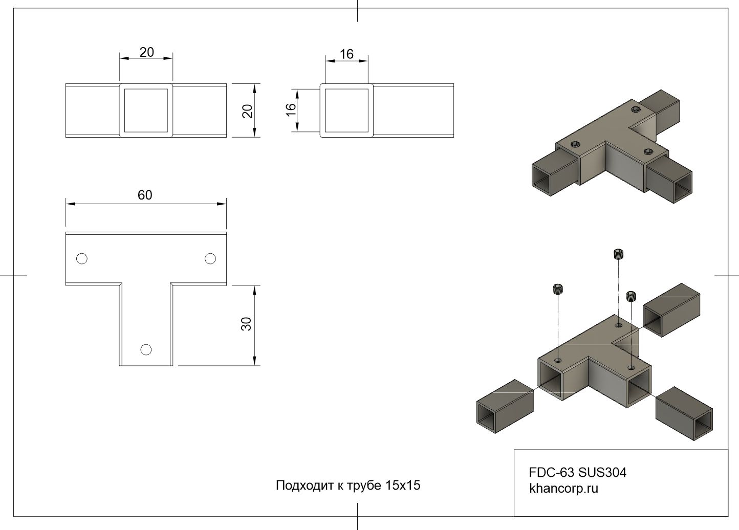 Соединитель FDC-63 представляет собой высоконадежный крепежный элемент, выполненный в виде буквы «Т». Он изготовлен из высококачественной нержавеющей стали, что обеспечивает превосходную устойчивость к коррозии и иным агрессивным внешним воздействиям, таким как повышенная влажность и химически активные вещества. Это позволяет сохранять исходные характеристики изделия и поддерживать его идеальный внешний вид на протяжении длительного времени эксплуатации.