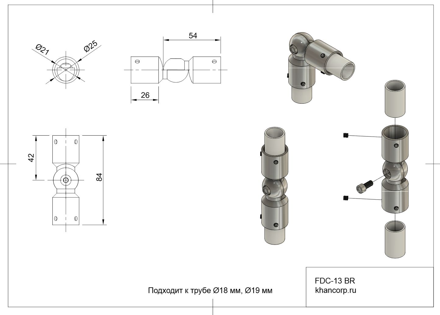 Соединитель FDC-13 представляет собой универсальный элемент, позволяющий надежно соединить круглые трубы диаметром 19 мм (совместим также с трубами диаметром 18 мм) под любым заданным углом в диапазоне от 90° до 180°. Такое конструктивное решение дает широкие возможности при создании индивидуальных решений и адаптацию к различным пространственным условиям.