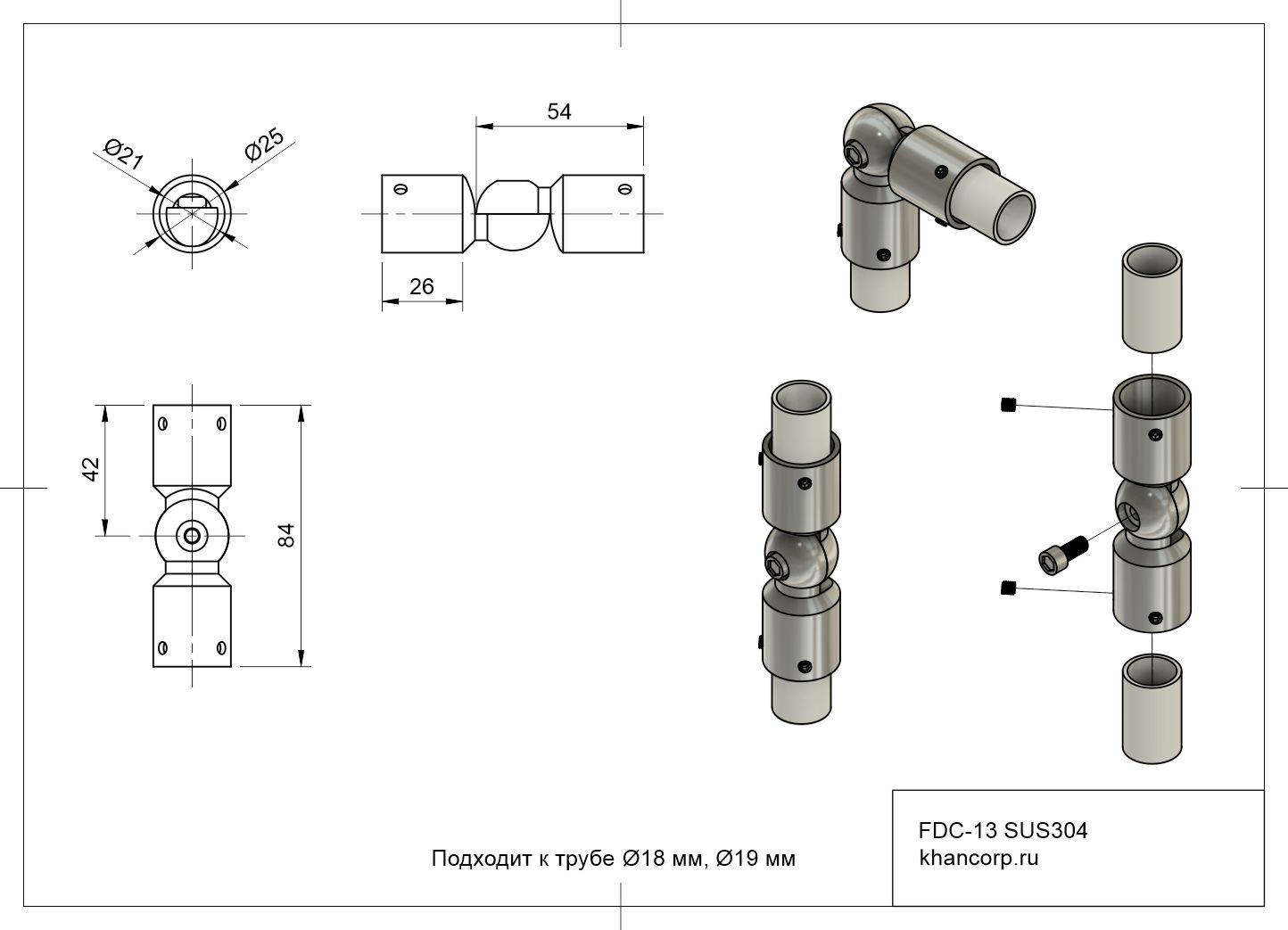 Соединитель FDC-13 представляет собой универсальный элемент, позволяющий надежно соединить круглые трубы диаметром 19 мм (совместим также с трубами диаметром 18 мм) под любым заданным углом в диапазоне от 90° до 180°. Такое конструктивное решение дает широкие возможности при создании индивидуальных решений и адаптацию к различным пространственным условиям.