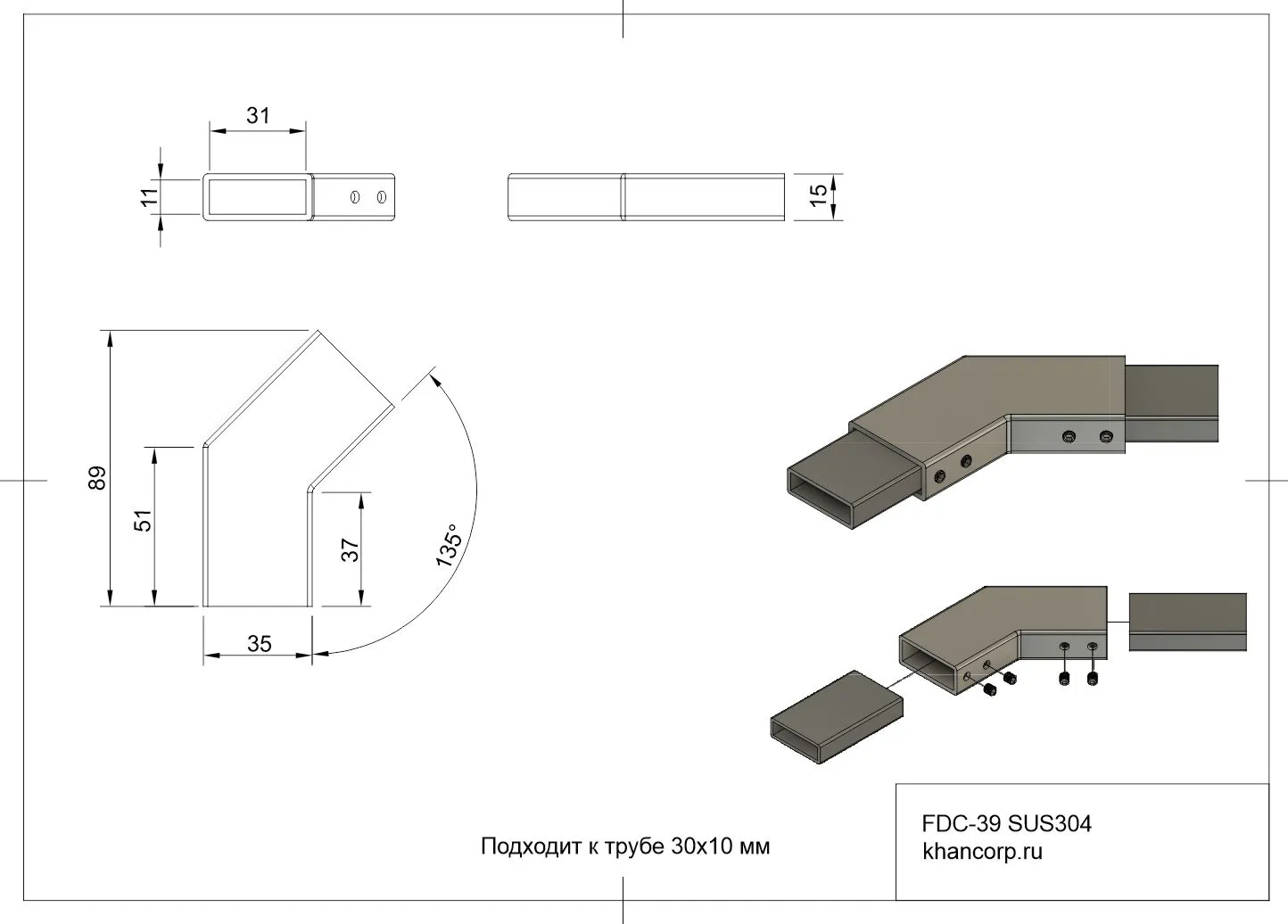 Соединитель труб FDC-39 горизонтального исполнения предназначен для надежного и удобного соединения прямоугольных труб сечением 30х10 мм под углом ровно 135 градусов. Эта деталь производится исключительно из высококачественной нержавеющей стали, которая обладает выдающейся устойчивостью к негативным влияниям окружающей среды, таким как повышенная влажность, температурные колебания и контакт с химическими веществами. Благодаря такому исполнению, соединитель долгое время сохраняет свои изначальные эксплуатационные свойства и презентабельный внешний вид, выдерживая многолетнюю эксплуатацию без изменения геометрии и признаков износа.