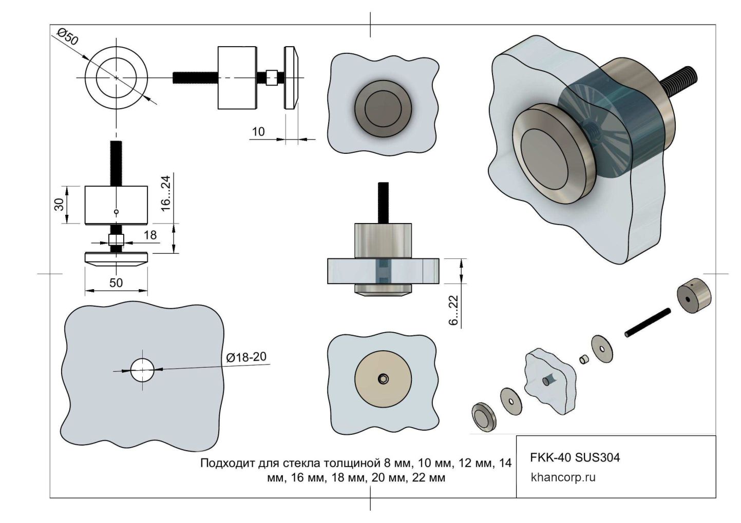 Стеклодержатель модели FKK-40 изготовлен из высококачественной нержавеющей стали марки SUS304, что обеспечивает надежность конструкции и устойчивость к коррозии даже в условиях повышенной влажности и агрессивных внешних факторов. Этот материал отличается долговечностью и эстетичным внешним видом, позволяя гармонично вписаться в интерьер любого помещения или фасад здания.