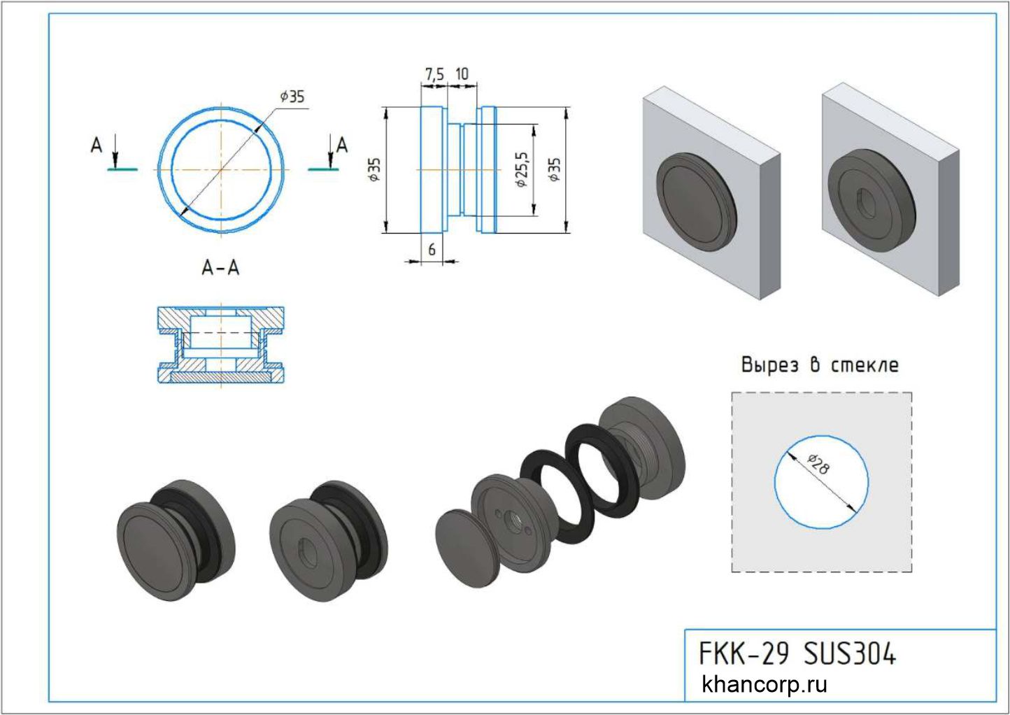 FKK-29 SUS304 — это специализированное точечное крепление диаметром 35 мм, оснащённое защитной крышкой, которое идеально подходит для надежной фиксации стеклянных конструкций толщиной 10 мм. Установка осуществляется быстро и удобно, поскольку не требует зенковки отверстий, что заметно упрощает монтаж.