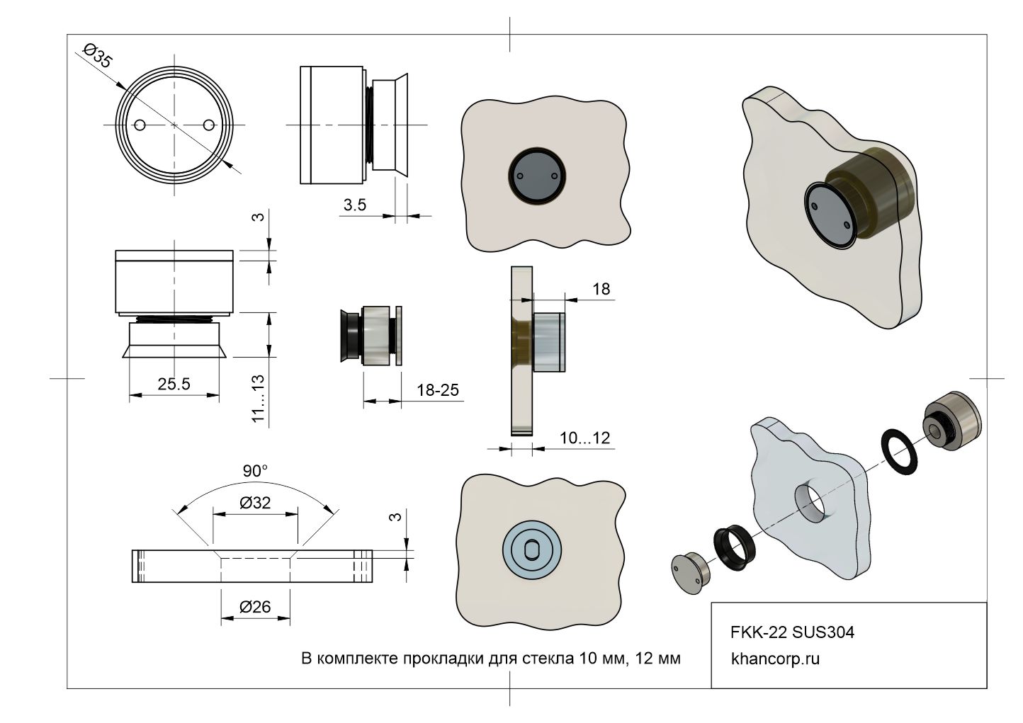 Точечное крепление FKK-22 SUS304/SSS диаметром 35 мм, имеющий регулируемую конструкцию отступа от стены и требующим отверстие под зенковку в стекле, произведён из нержавеющей стали с матовой поверхностью. Предназначен для установки стеклянных панелей толщиной 10–12 мм. Диаметр технологического отверстия в стекле — 26 мм. Расстояния от стены до плоскости стекла регулируется в пределах от 18 до 25 мм.