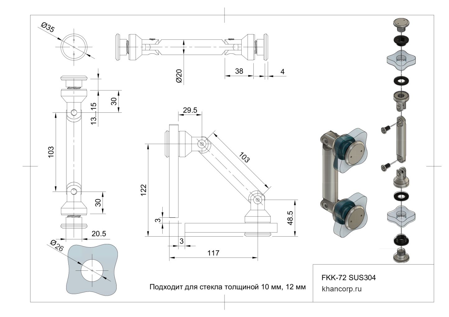 Точечный соединитель стекло-стекло FKK-72 SUS304 представляет собой высококачественное решение для крепления двух стеклянных поверхностей друг к другу без необходимости предварительных работ по подготовке отверстий («без зенковки»). Выполненный из первоклассной нержавеющей стали марки SUS304, он отличается повышенной устойчивостью к неблагоприятным погодным условиям, коррозии и механическим нагрузкам, что особенно важно при применении в наружных конструкциях.