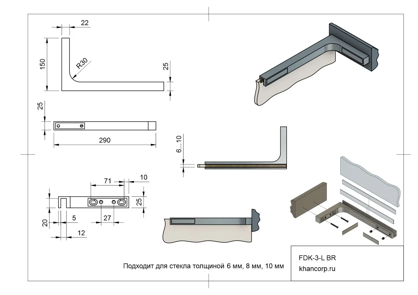 Угловой стабилизатор Диор FDK-3L (левосторонний) - премиальная фурнитура для крепления закаленного стекла к стене под углом 90°.