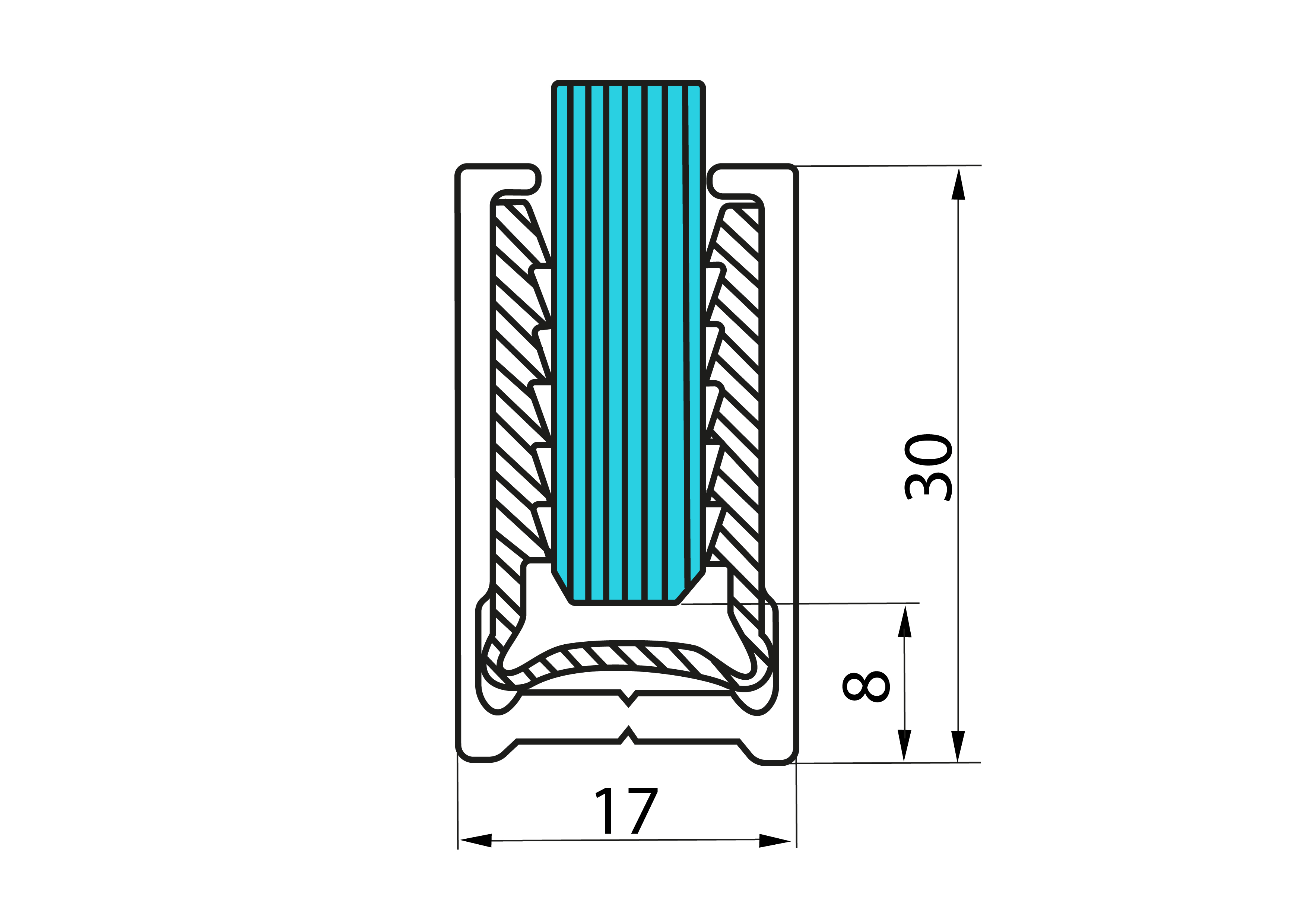 Уплотнитель FDPA-541 для П-образного опорного профиля FDPA-54. Размер 30 мм х 17 мм х 2 мм, для стекла 8 мм, цвет черный.