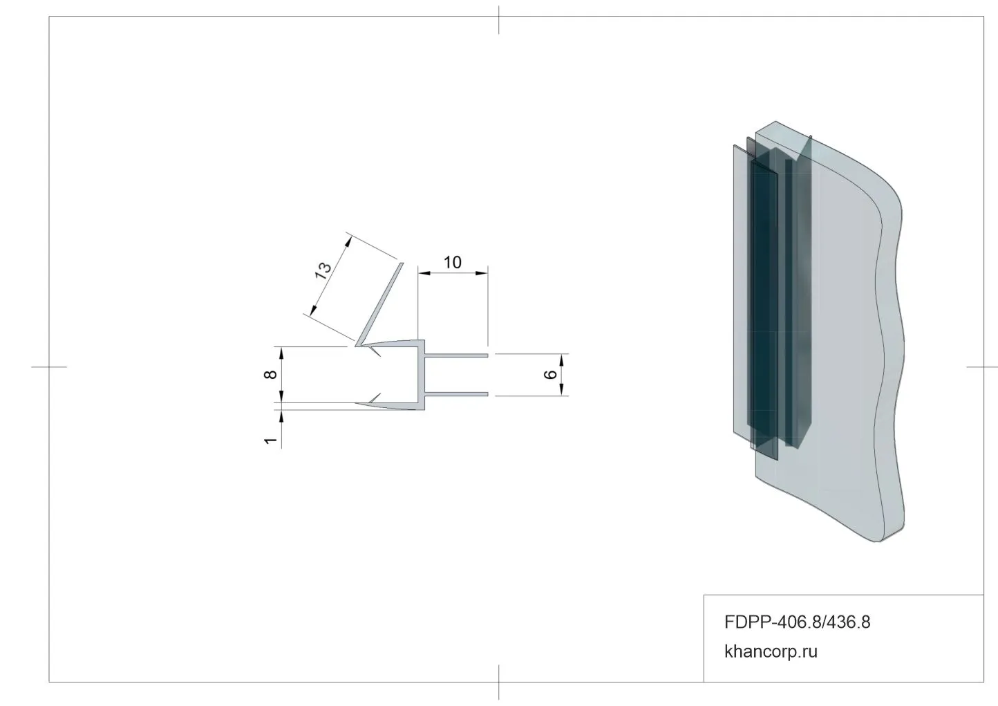 Для предотвращения протечек воды за пределы душевой кабины применяется силиконовый уплотнитель FDPP-406.8. Данный элемент, произведенный из поливинилхлорида (ПВХ), эффективно препятствует проникновению влаги. Конструкция предусматривает наличие жесткого установочного элемента длиной 13 мм. Материал характеризуется повышенной устойчивостью к истиранию.