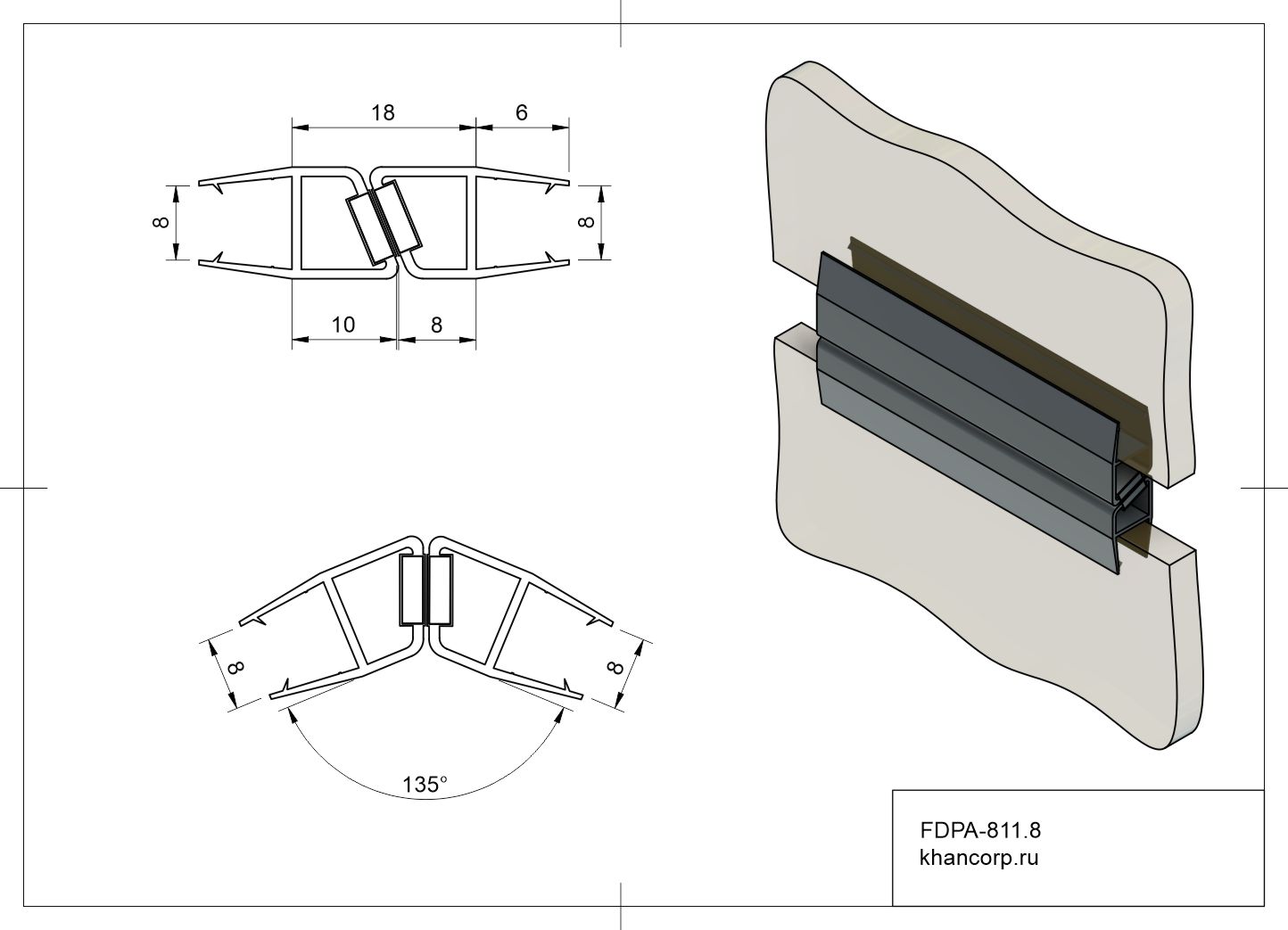 Этот уплотнитель разработан для стекла толщиной 8 мм и имеет глубину посадки 7 мм. Чаще всего его применяют в распашных душевых кабинах, где он обеспечивает открывание дверей на 180° или 135° – угол зависит от способа установки профиля. Монтаж осуществляется простым нажатием: один профиль фиксируется на двери, другой – на неподвижной стеклянной панели. За счет уменьшенной высоты посадки, уплотнитель придает душевой кабине более эстетичный вид.