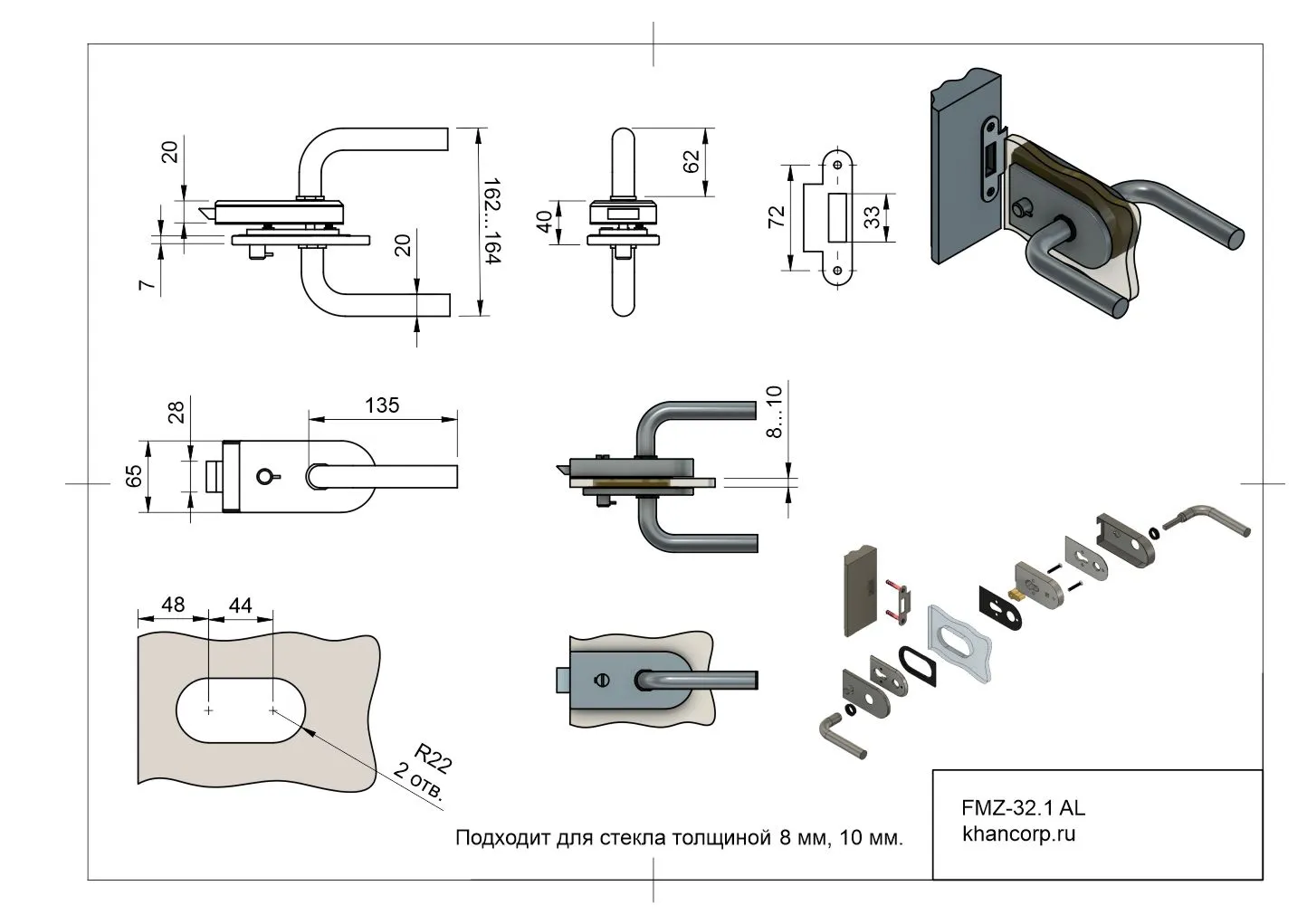 Замок FMZ-32.1 оборудован механизмом сантехнической защелки, системой притвора и ответной планкой для стены. Изготовлен из алюминия. Подходит для стеклянных полотен толщиной 8, 10 и 12 мм. Процесс анодирования усиливает прочность металла, покрывая его слоем оксида, который эффективно противостоит агрессивным условиям внешней среды, предотвращая возникновение коррозии и механические повреждения.